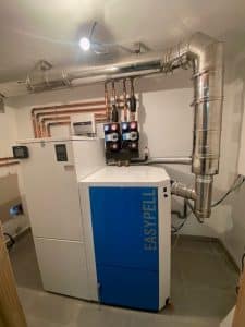 Dans ce projet, plusieurs défis se sont présentés. Tout d’abord, il fallait prendre en compte la gestion indépendante de l’eau chaude sanitaire, déjà assurée par un ballon électrique. De plus, la maison était équipée d’un système de chauffage mixte, avec à la fois un plancher chauffant et des radiateurs, nécessitant la gestion de deux températures différentes. Pour répondre à ces exigences, nous avons installé une chaudière à pellets avec un mini silo pour un chargement manuel, ainsi qu’un kit 2 zones pour contrôler les températures de manière précise et efficace. Le système est également pilotable à distance, offrant ainsi un confort supplémentaire et une facilité d’utilisation.